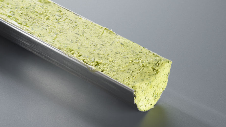 Die schaumige Rucola-Limettenbutter in Känelformen ohne Lufteinschlüsse einfüllen und tiefkühlen. Danach ausformen und in Scheiben von 5 g schneiden.