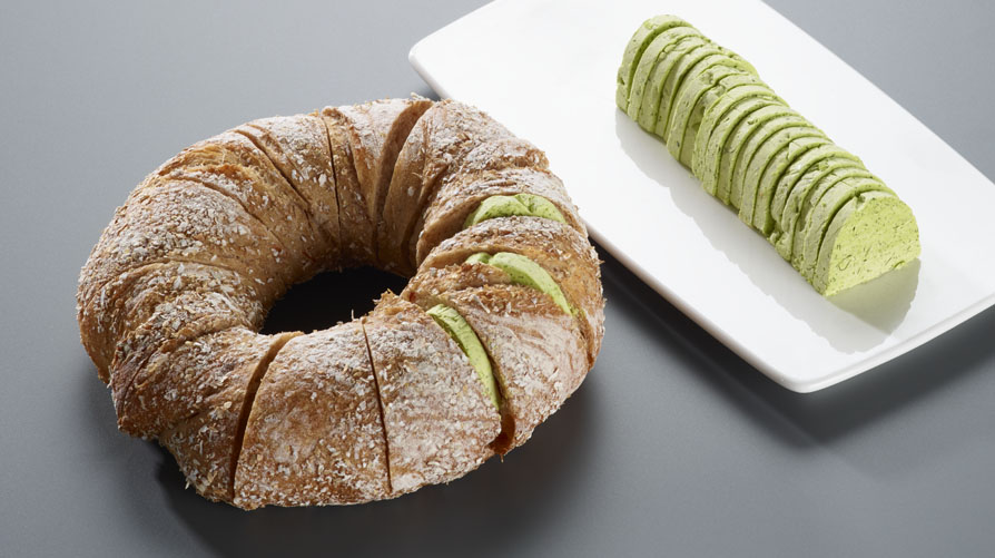 Nach dem Auskühlen 12 Mal senkrecht einschneiden, so dass das Brot noch zusammenhält. In die Einschnitte des Tomaten-Bürlibrots je eine Scheibe gefrorene Rucola-Limettenbutterscheibe reinlegen.