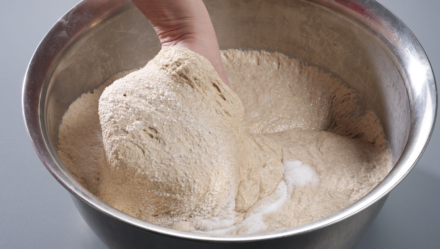 Die Rezeptur verlangt weder weiteres Mehl noch Wasser. Die beiden Vorteige werden nun mit dem Speisesalz zusammen schonend von Hand oder im Planetrührwerk gemischt, bis das Salz gleichmässig verteilt ist. Dabei wird die Teigstruktur, die sich während der langen Stockgare gebildet hat, nur minimal beansprucht. Deshalb ist diese Methode auch besonders für Vollkornbrote aus Emmer oder Einkorn geeignet.