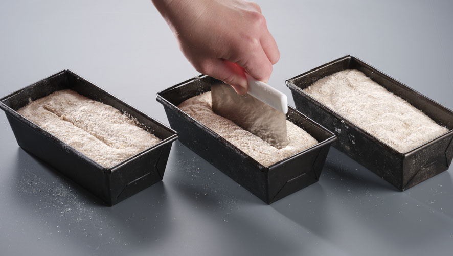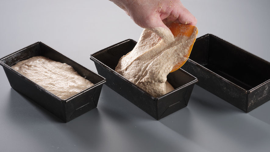Direkt nach dem Mischen je 600 g Teig in die gefetteten Formen geben (18×9×8 cm).