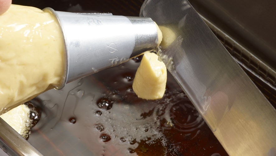 Portion the mixture directly into the hot fat using a piping bag with a 12 mm nozzle.