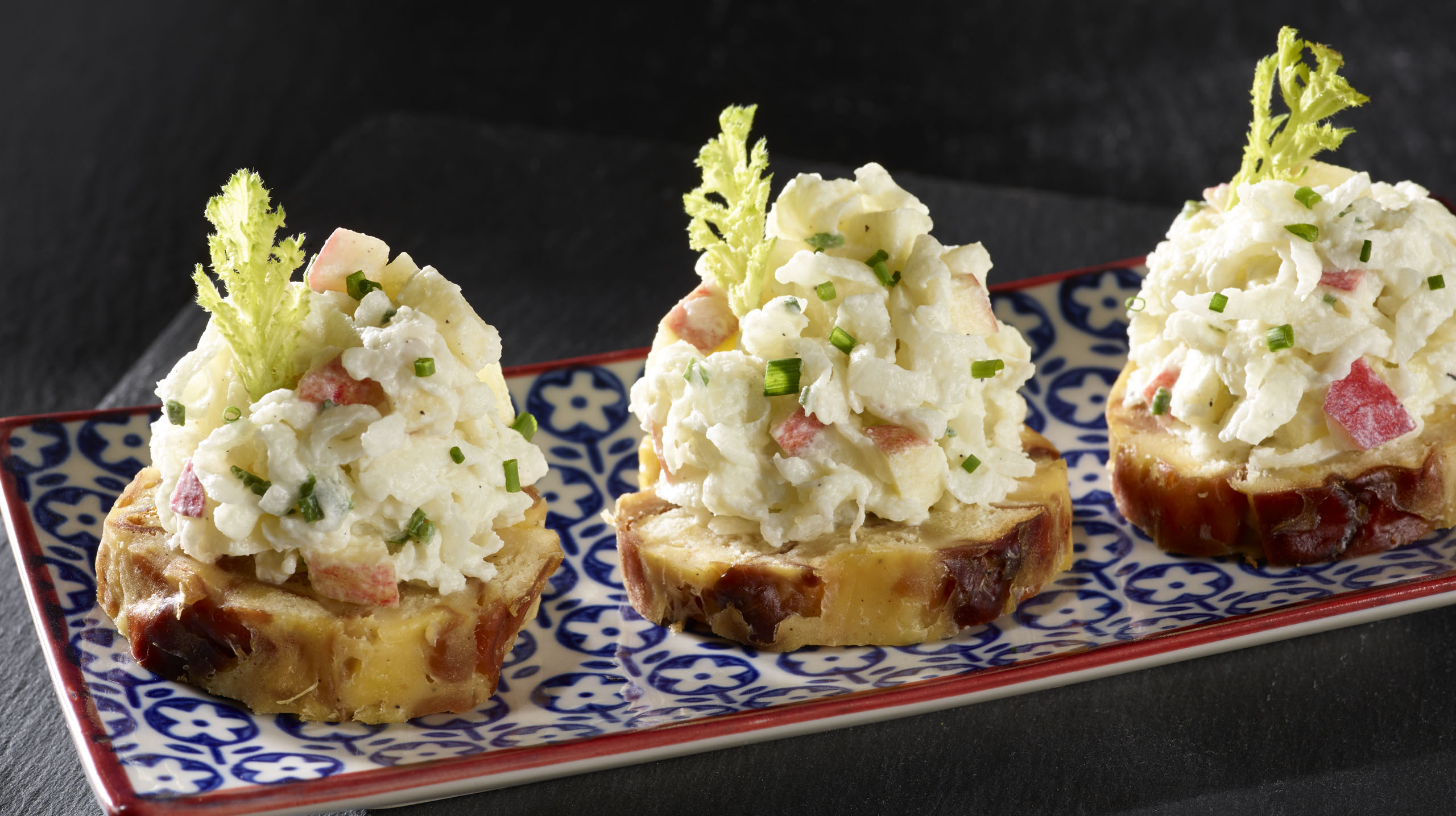 Place the radish salad on top with an ice cream scoop and garnish the appetizers with fresh chives or radish greens. Serve at room temperature.