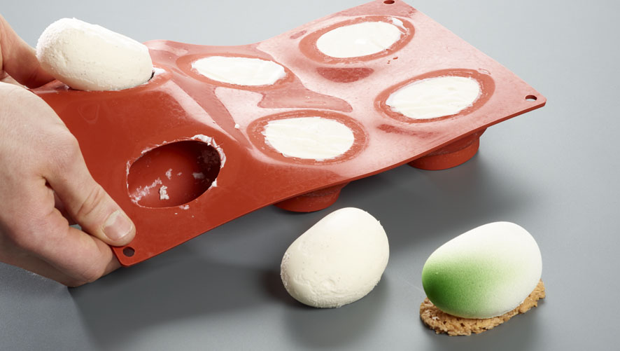 Unmold the frozen pastries. Spray evenly all around with white confectionery paste. Lightly spray green coating on one side to create a jade stone effect.