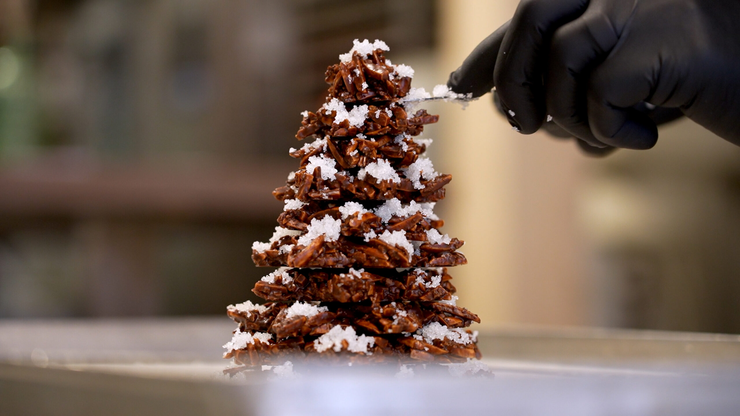 Place the Roches stars on top of each other in descending size with tempered couverture. Leave to crystallize at 18-20°C until the structure is stable.