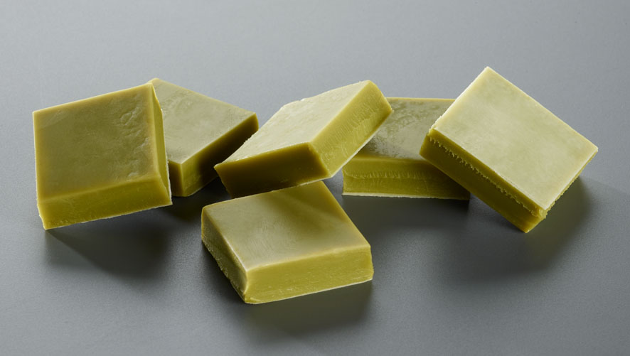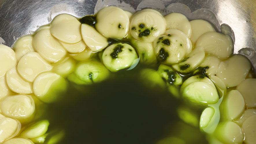 Melt the couverture together with the cocoa butter. Mix in the matcha powder (do not stir with a whisk – risk of lumps forming). Then place the mixture in the warming cabinet for several hours.