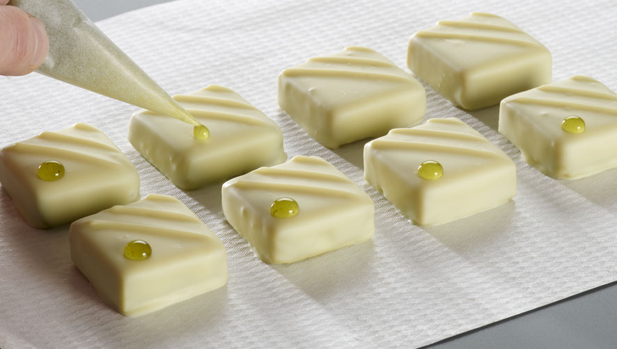 Fill the cooled matcha syrup into a cornet and pipe drops onto the pralines. Allow the syrup to set completely.