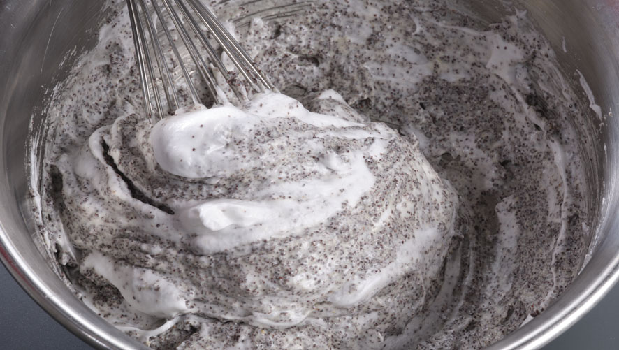 Place 70 g of beaten egg whites (meringue) in a piping bag with a medium nozzle and set aside for decoration. Carefully fold the remaining beaten egg whites into the poppy seed cream and continue processing immediately.