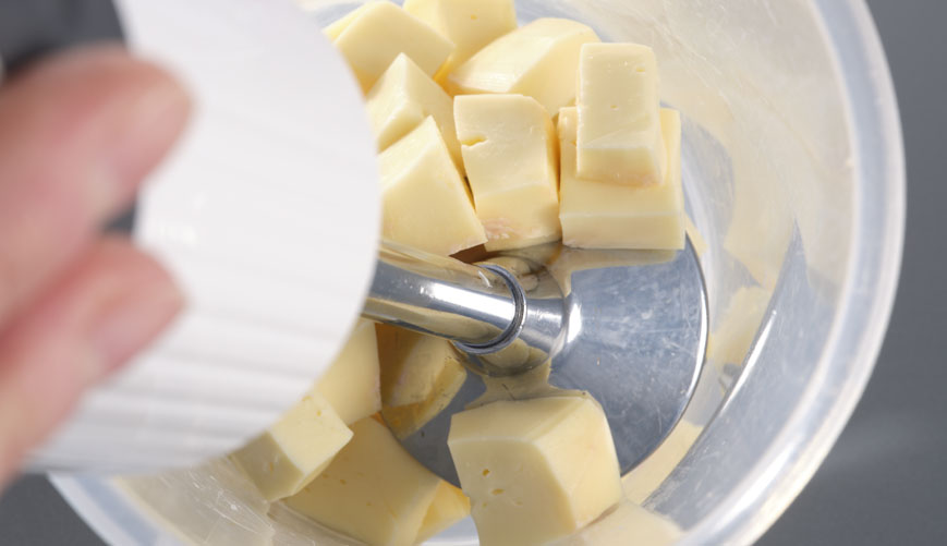 Place the Münster cheese in the freezer for about 20–30 minutes to firm it up. Then, using a vegetable peeler, remove the rind as thinly as possible. Alternatively, the rind can be cut off with a knife, though this will waste more cheese. Freezing makes it easier to peel cleanly.