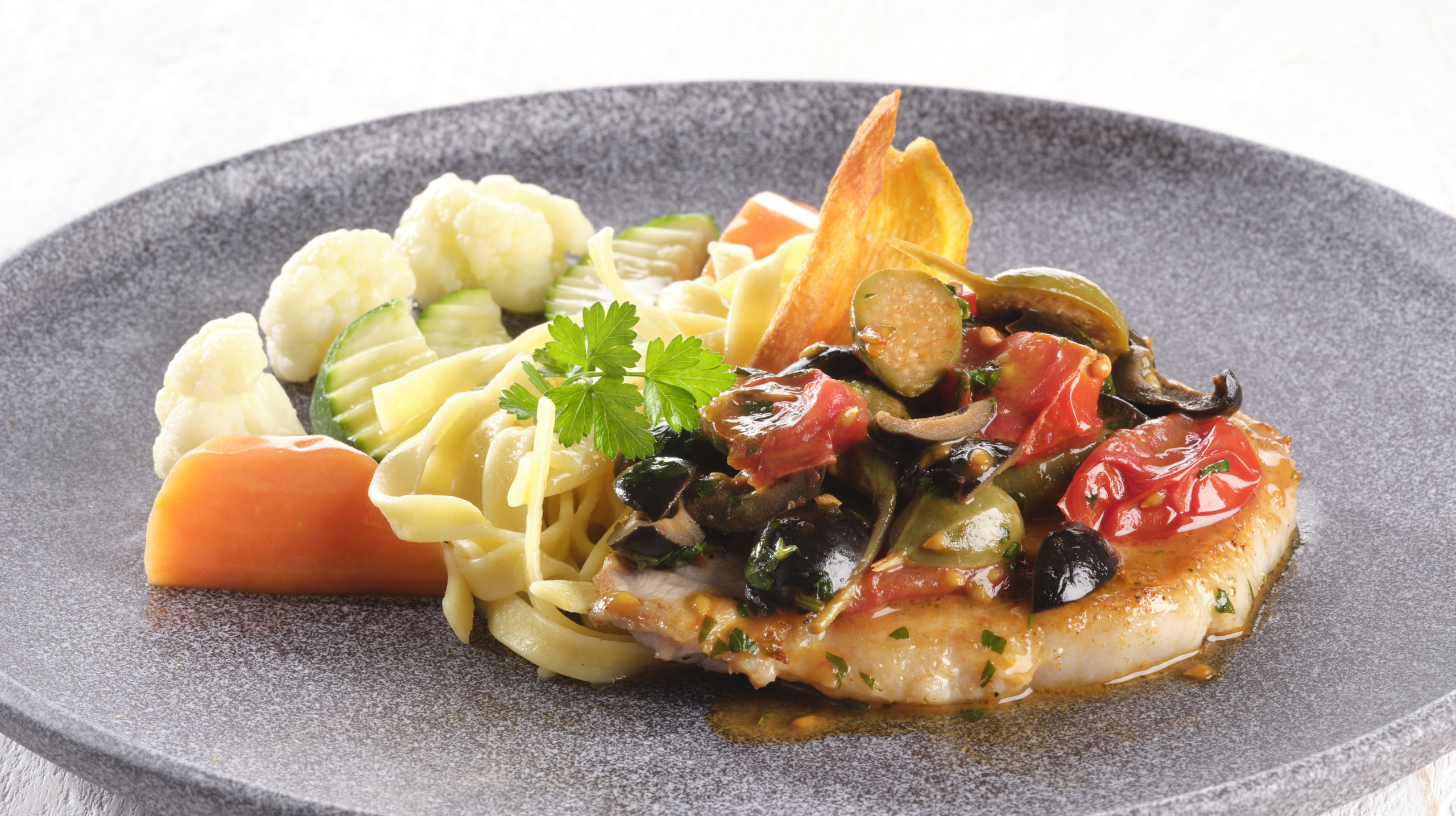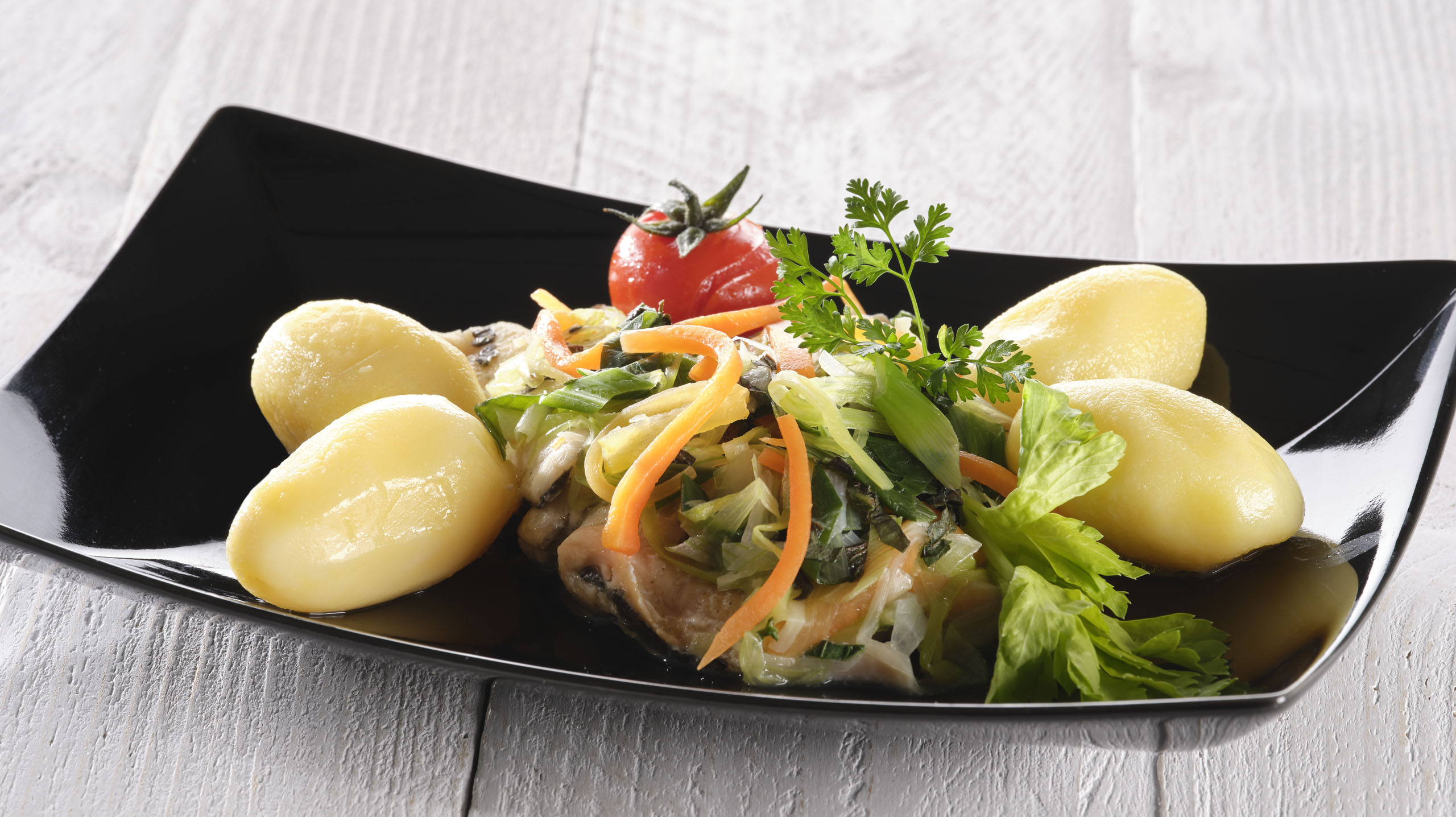 Felchenfilet mit Gemüsestreifen, Kräutern und Weisswein