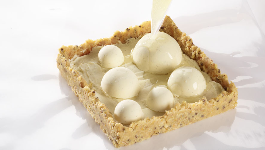 Die grössere Menge der Cheesecake-Creme wird auf den vorbereiteten Boden dressiert. Die restliche Creme wird in Halbkugel-Silikonformen verschiedener Grössen gefüllt.