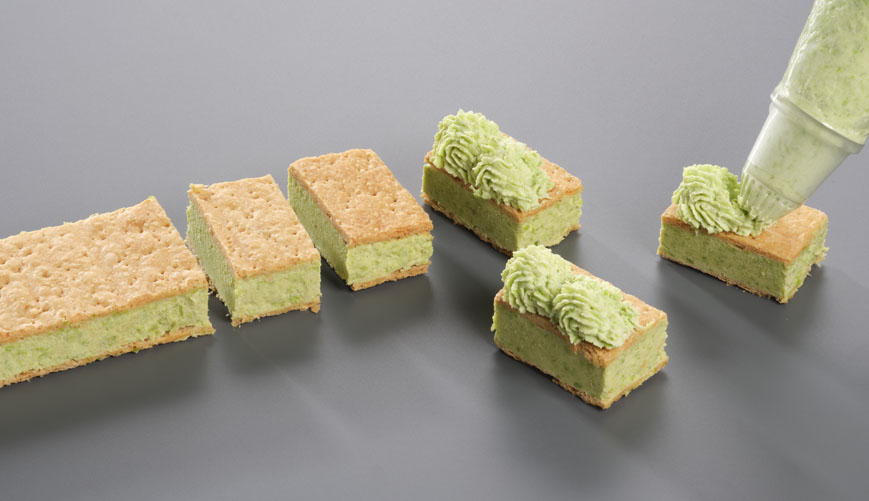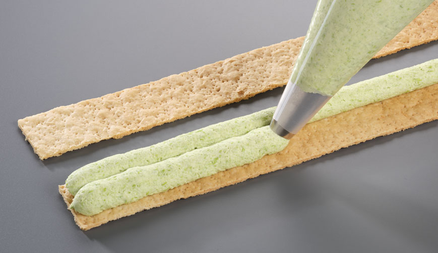 270 g Edamame-Füllung auf einen Blätterteigstreifen dressieren, zweiter Blätterteigstreifen auflegen und leicht andrücken. Wenn notwendig, auf der Seite auffüllen oder abziehen. Im Tiefkühlraum bei -18°C kurz anfrieren.