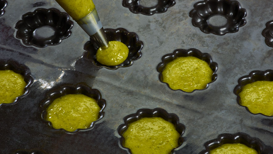Menge: Je 13 g Pistazien-Buttermasse pro Form einfüllen.