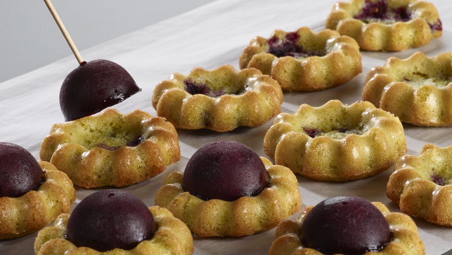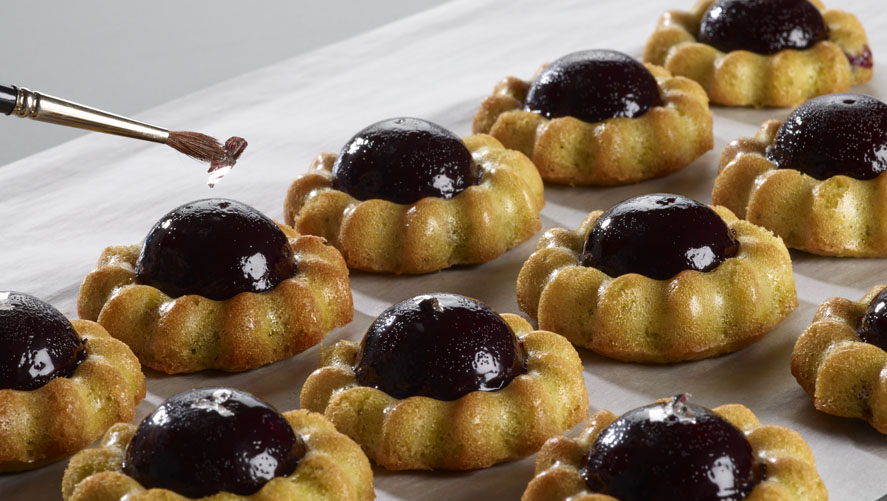 Vor dem Backen je ca. 5 g geviertelte, tiefgekühlte Kirschen auf die Oberfläche der Masse setzen – dabei darauf achten, dass das grüne Pistazienaroma optisch erhalten bleibt.