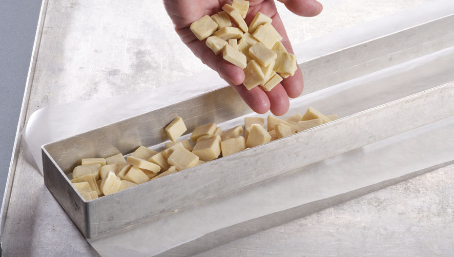 Teigabschnitte aus der Buttergipfelproduktion auf Blechen verteilen und im Tiefkühler bei -18°C durchkühlen lassen. Dann mit dem Messer in Würfel von 1×1 cm schneiden.