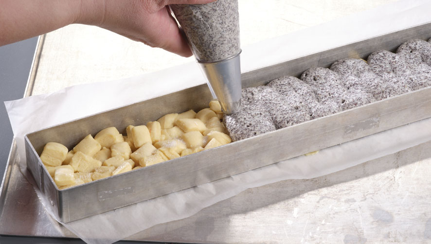 Metallrahmen 8×60×4 cm fetten, auf Blech mit Silikonpapier stellen und 500 g gewürfelter Buttergipfelteig gleichmässig darin verteilen.
