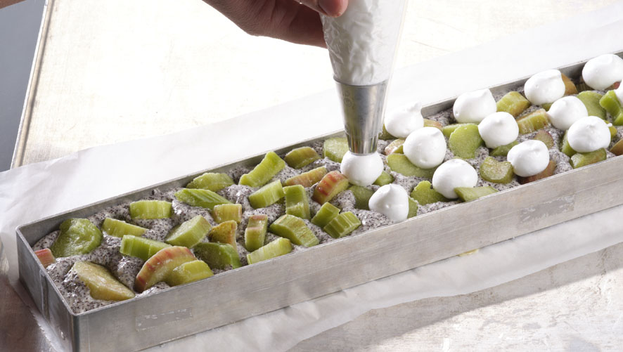 15 g Zucker einstreuen, dann 500 g Mohnschaumcreme auf den gegärten Gipfelteig dressieren und 300 g geschnittene Rhabarberwürfel darauf verteilen und leicht in die Masse reindrücken.